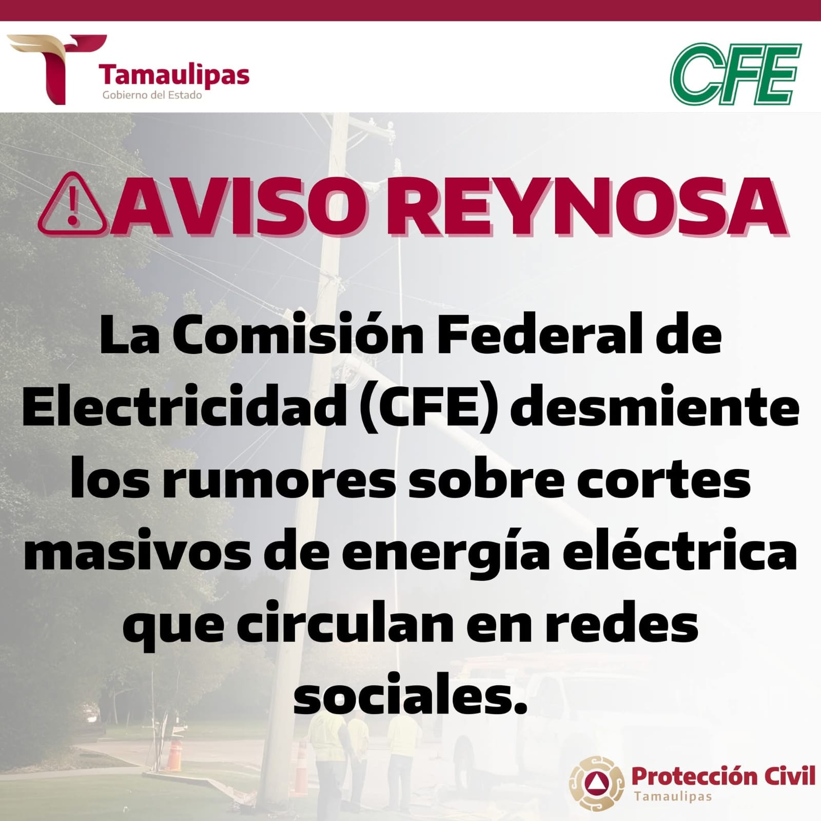 La Comisión Federal de Electricidad (CFE) desmiente los rumores sobre cortes masivos de energía eléctrica que circulan en redes sociales.