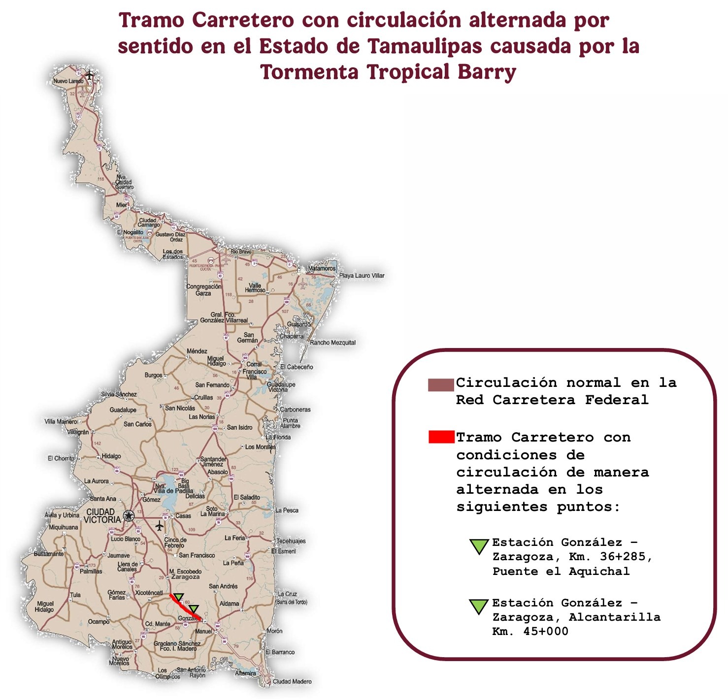 Asimismo, se sugirió a los automovilistas considerar rutas alternas si se viaja de Tampico a Victoria: González – Mante – Xicoténcatl – Zaragoza – Ciudad Victoria.