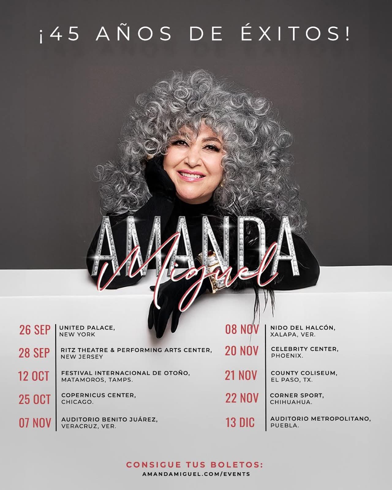 H. Matamoros, Tamaulipas.- El gobierno municipal de Matamoros, encabezado por Beto Granados, compartió en sus redes sociales la publicación de la reconocida cantante Amanda Miguel, quien anunció oficialmente las fechas de sus próximas presentaciones con motivo de la celebración por sus 45 años de trayectoria artística. Entre estas fechas destaca su participación en el Festival Internacional de Otoño, a realizarse el 12 de octubre en la Plaza Principal de Matamoros.