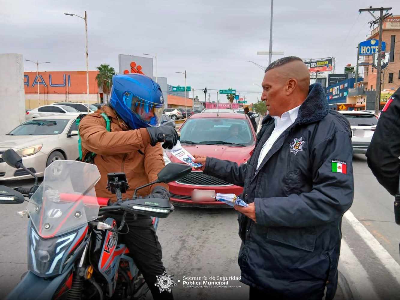 H. Matamoros, Tamaulipas.- Siguiendo las instrucciones del alcalde Beto Granados, elementos de Tránsito y Vialidad llevaron a cabo la entrega de folletería informativa a automovilistas, con el objetivo de concientizar sobre la importancia de extremar precauciones al conducir ante el incremento del flujo vehicular en la ciudad.
