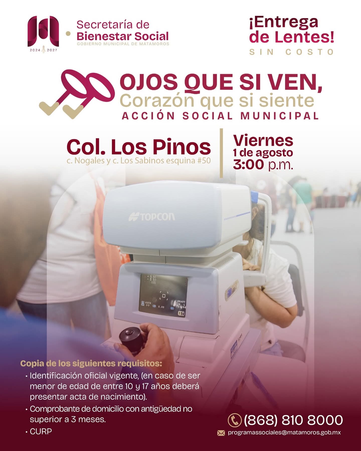 H. Matamoros, Tam.- El Gobierno Municipal que encabeza Beto Granados invita a todas las familias de la colonia Los Pinos y sectores cercanos a participar este viernes 1 de agosto en una jornada de Acción Social Municipal, que se realizará a partir de las 3:00 de la tarde en la esquina de calle Nogales y calle Los Sabinos #50.