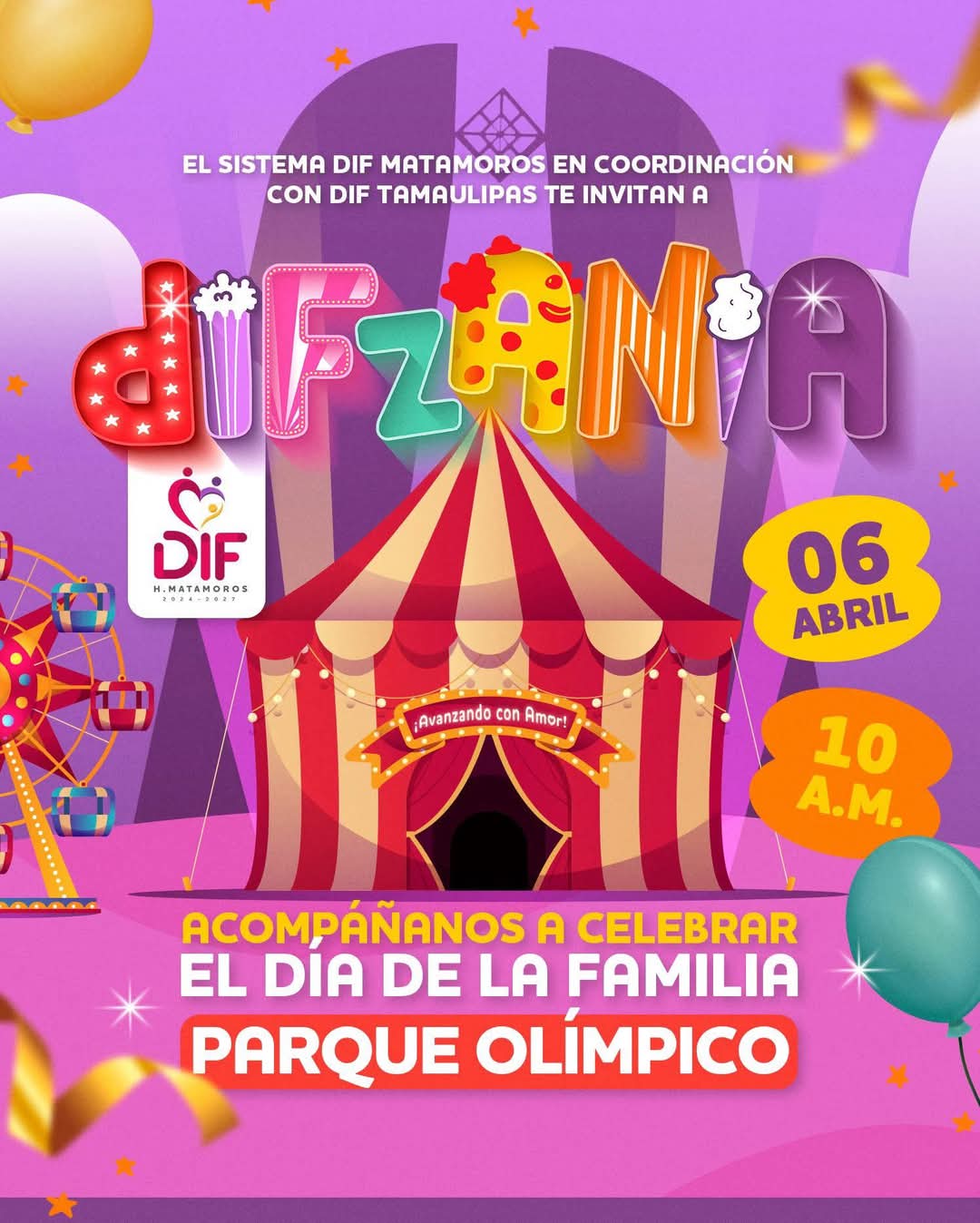H. Matamoros, Tamaulipas.- El Gobierno de Matamoros, encabezado por el alcalde Beto Granados, en coordinación con el DIF Municipal, invita a todas las familias a disfrutar de DIFzania, un evento lleno de magia y diversión que se llevará a cabo este domingo 6 de abril en el Parque Olímpico.