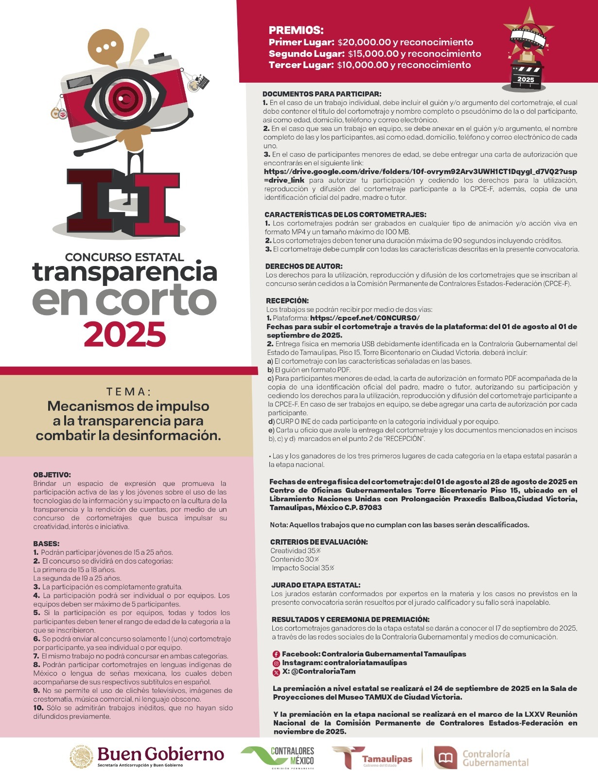 La convocatoria se divide en dos categorías de 15 a 18 años de edad y de 19 a 25 años y podrás consultar el resto de los requisitos en las redes sociales de la Contraloría Gubernamental.