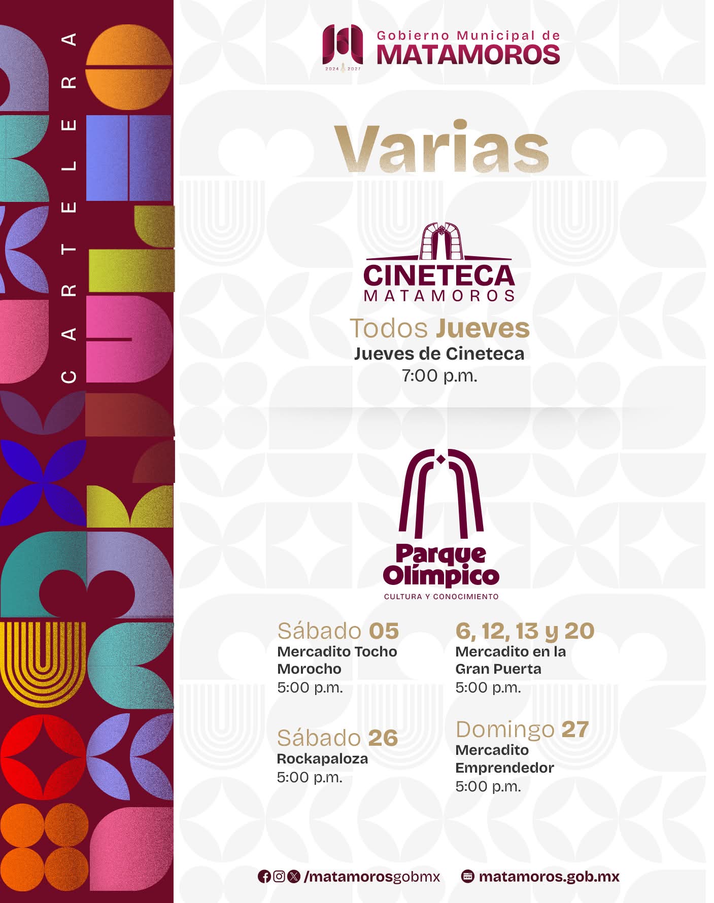 El Gobierno Municipal invita a la población a consultar la cartelera completa en sus redes sociales oficiales y en distintos puntos informativos de la ciudad, para que puedan agendar con tiempo y ser parte de estos eventos que demuestran que Matamoros avanza.